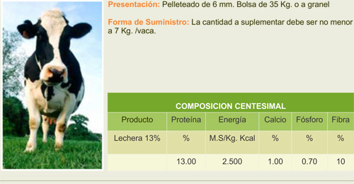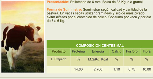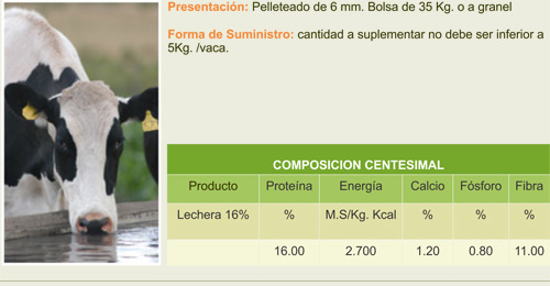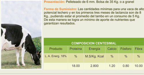 Alimento balanceado para ser suministrado a vacas de media producción láctea, con la característica de corregir los pastoreos con aportes importantes de proteínas y energía, causando un aumento significativo de la producción y la reproducción en el rodeo promedio. A su vez actúa como un suplemento mineral con ionóforo incluido, ventaja del ionóforo 6,7% más de leche.